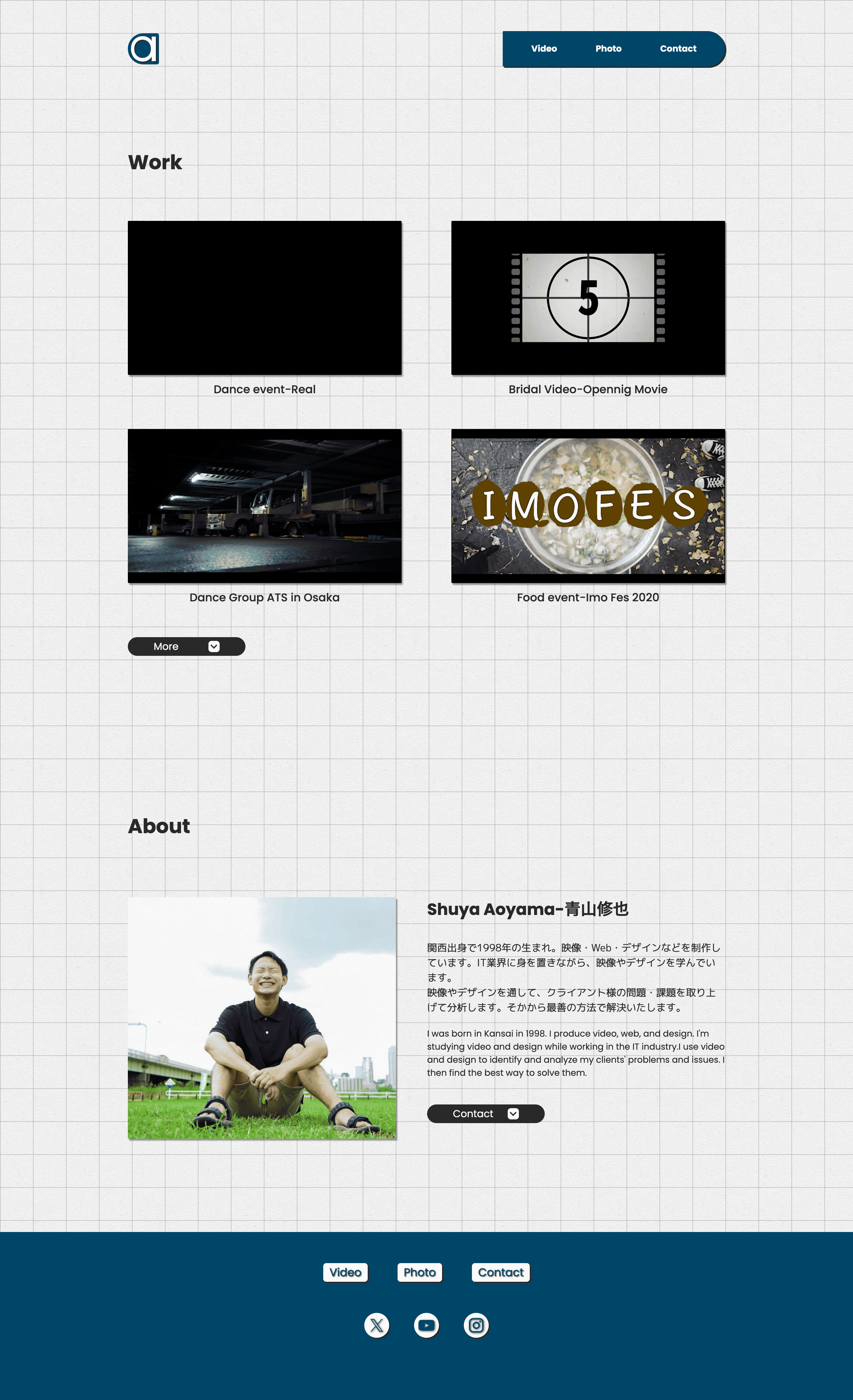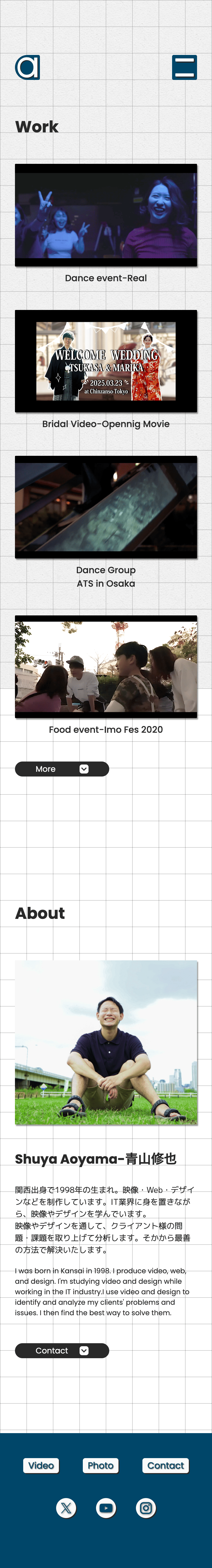 背景グリッド線(50px)でノートモチーフを表現。ホバー時に動画自動再生。 -